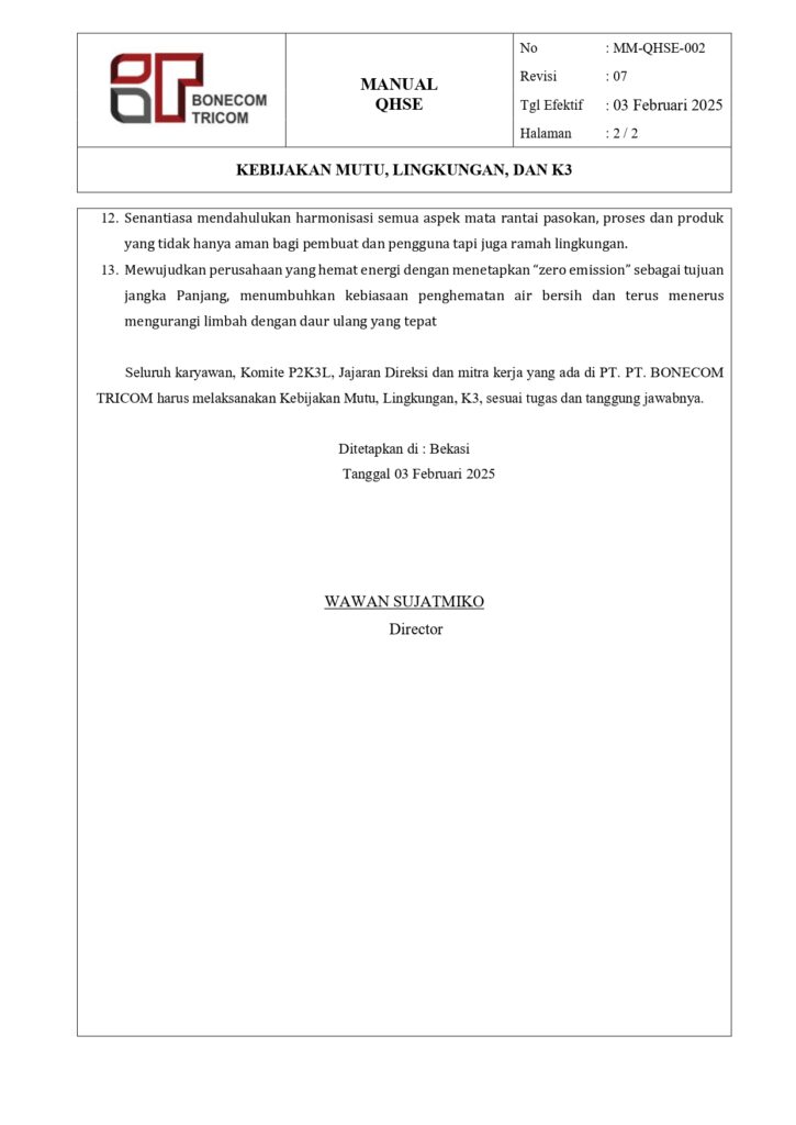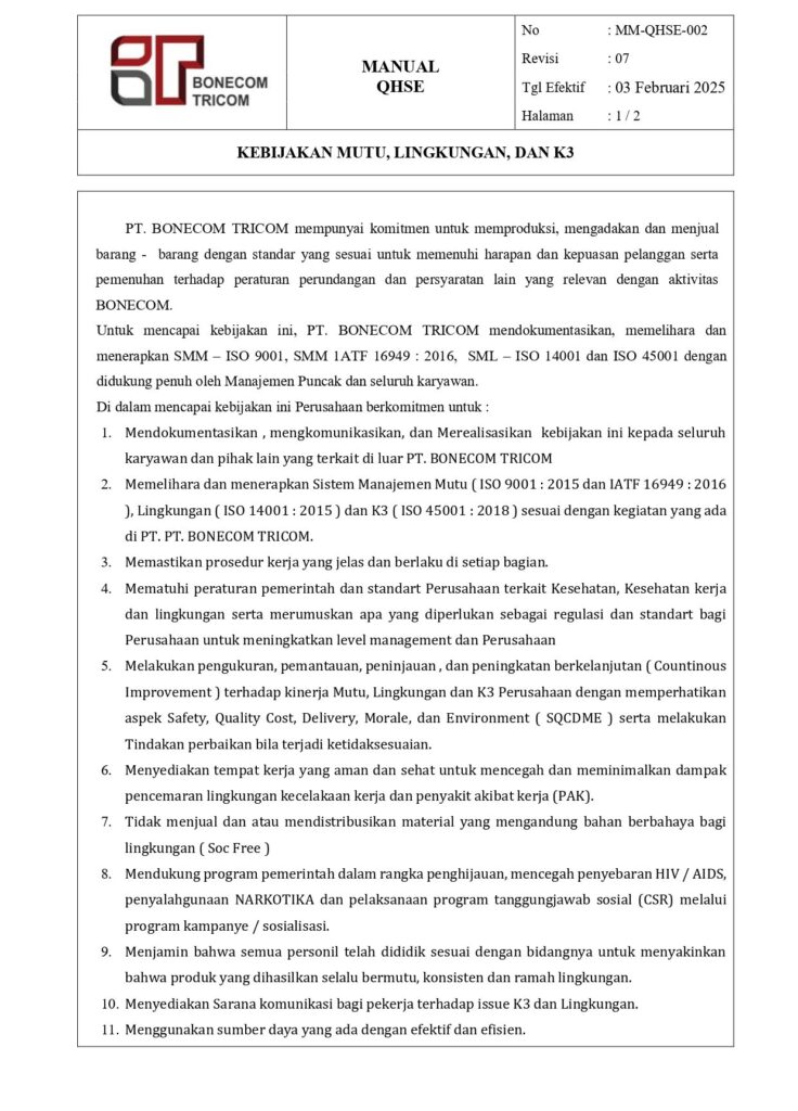 On the basis of Bonecom Tricom, governmental regulation, legislation, customer requirement and other requirements in relation to our policy.