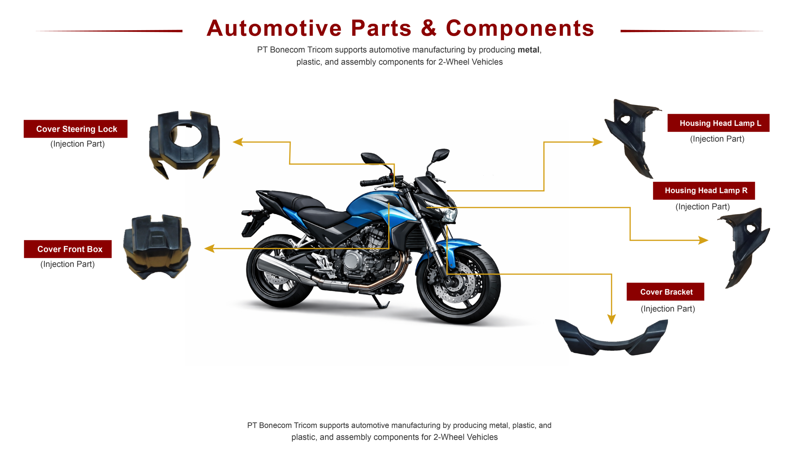At PT Bonecom Tricom, we are committed to delivering innovative, high-performance, and cost-effective solutionsfor 2-wheel vehicle manufacturers. Our expertise in precision engineering and quality assurance makes us a reliable partner for global and local brands.